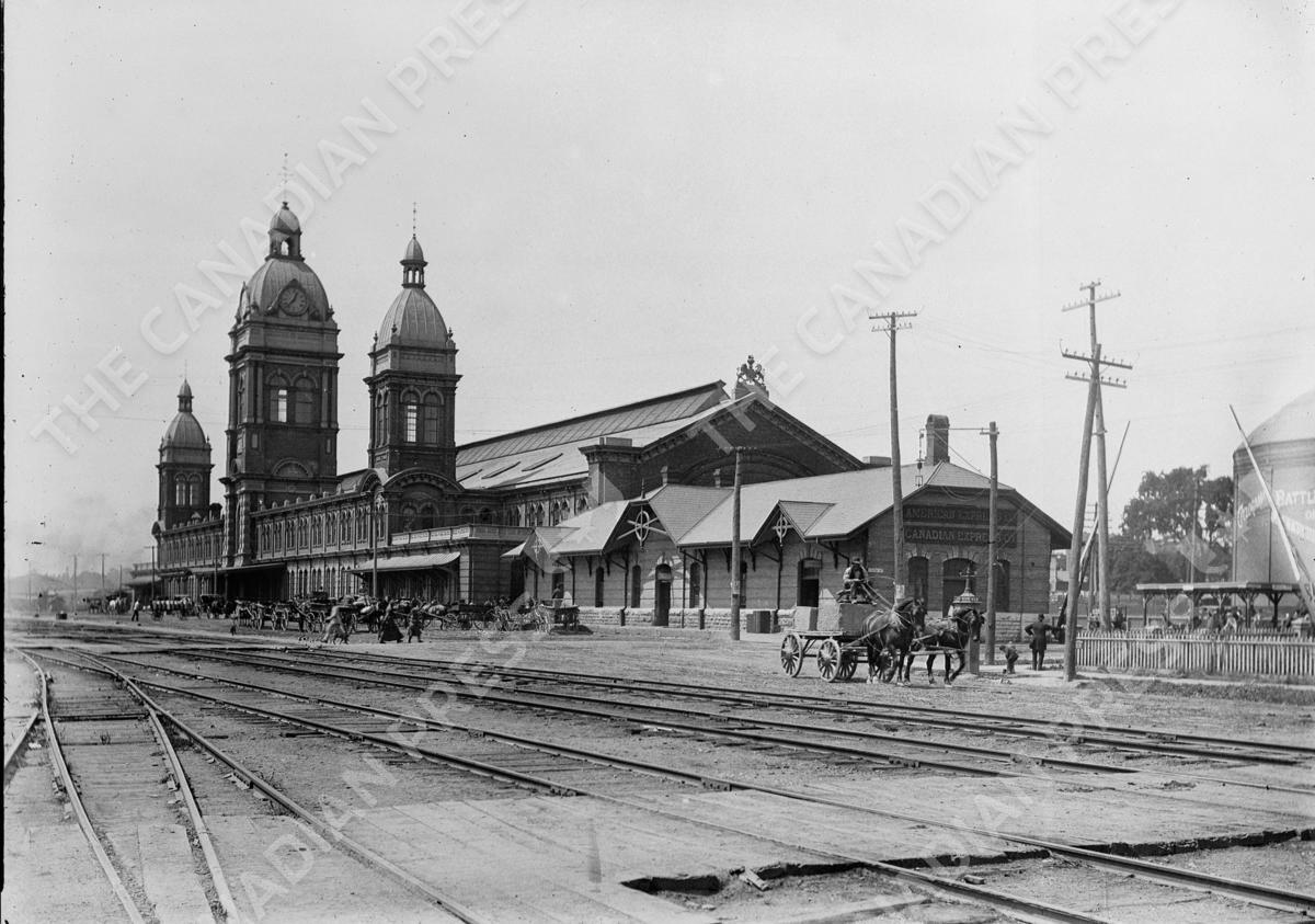 Toronto Ontario ca.1855 Cities - Old Toronto Union St.ation before trainshed extension was built - taken from York St. level crossing looking north west(CP PHOTO) 1999 (Frank Micklethwaite National Archives of Canada)PA-146822