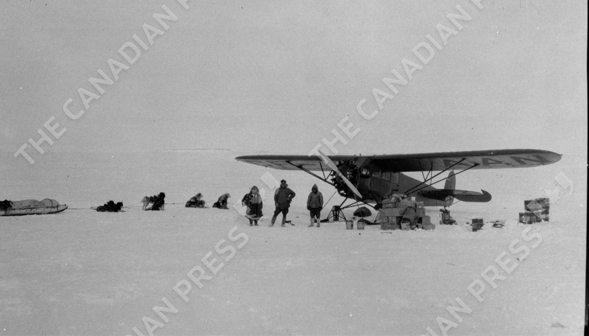 Coppermine Coronation Gulf,North West Territories; April 1931--Transportation-- A contrast in modes of travel; Mat Berry's aeroplane and Dick Finnie's dog team, Coppermine, Coronation Gulf, N.W.T., April 1931.(CP PHOTO) 1999 ( National Archives of Canada/R.S. Finnie ) PA-100602