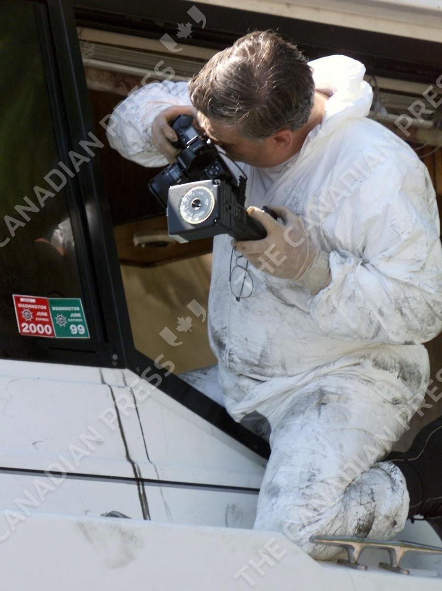 RCMP Cpl. J.J. Van Tassel leans out a broken window aboard the pleasure vessel "Sun Boy" to photograph Washington State safety stickers attached to the vessel during an investigation in West Vancouver Monday Aug. 9, 1999. The 15-metre boat ran between and tugboat and a barge late Saturday night striking the towing cable. Five of fourteen on board were killed.(CP PHOTO/Chuck Stoody)