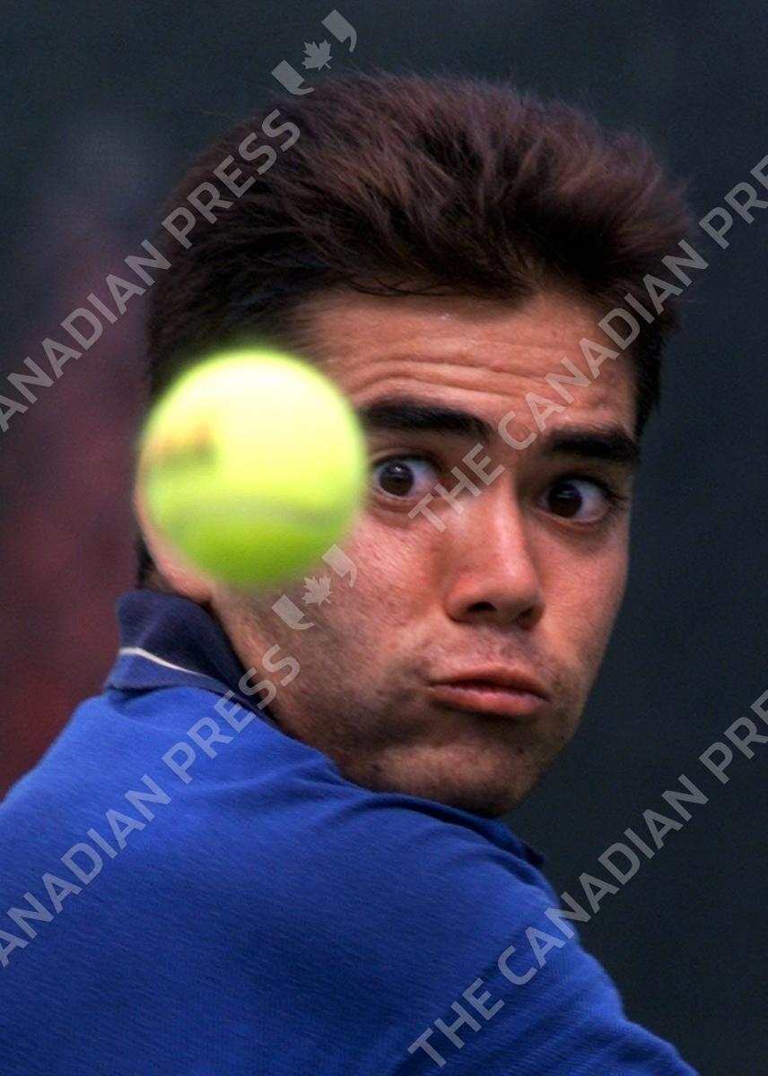 Johny Romero of Venezuela keeps a close eye on the ball during his second round match against David Abelson of Canada at the Pan American Games in Winnipeg, Man. on Saturday, July 31, 1999. (CP PHOTO/Frank Gunn)