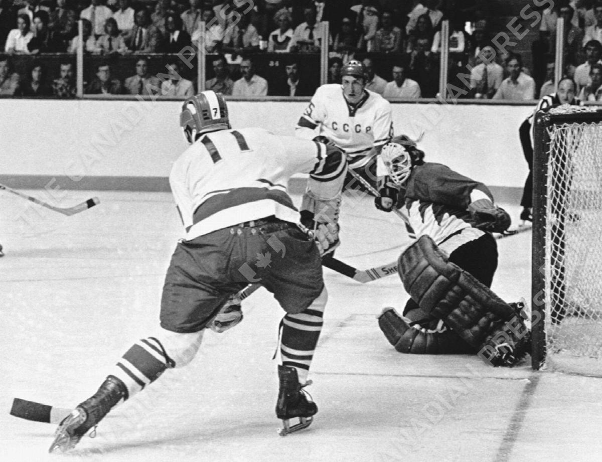 (CPT 39-Sept. 25)--SURROUNDED--Canadian goalie Ken Dryden is surrounded by unidentified Soviet players Sept. 2, 1972 during Canada's hockey series with the former Soviet Union. (CP PHOTO) 1997 (fls-stf)