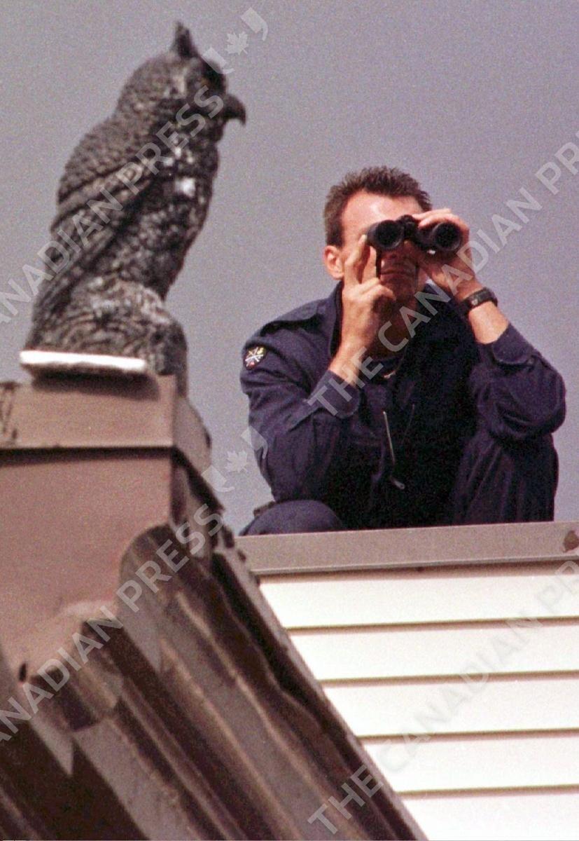 (MTL 103)MONTREAL SEPT 12--GUARD FUNERAL--A member of Montreal's Police Tactical Unit views the crowd attending the funeral of murdered prison guard Pierre Rondeau, who was gunned down while driving a prison van earlier this week. Rondeau is the second Quebec prison guard to be murdered in a span of a few months. (CP PHOTO)1997 (str-Robert Galbraith)rjg