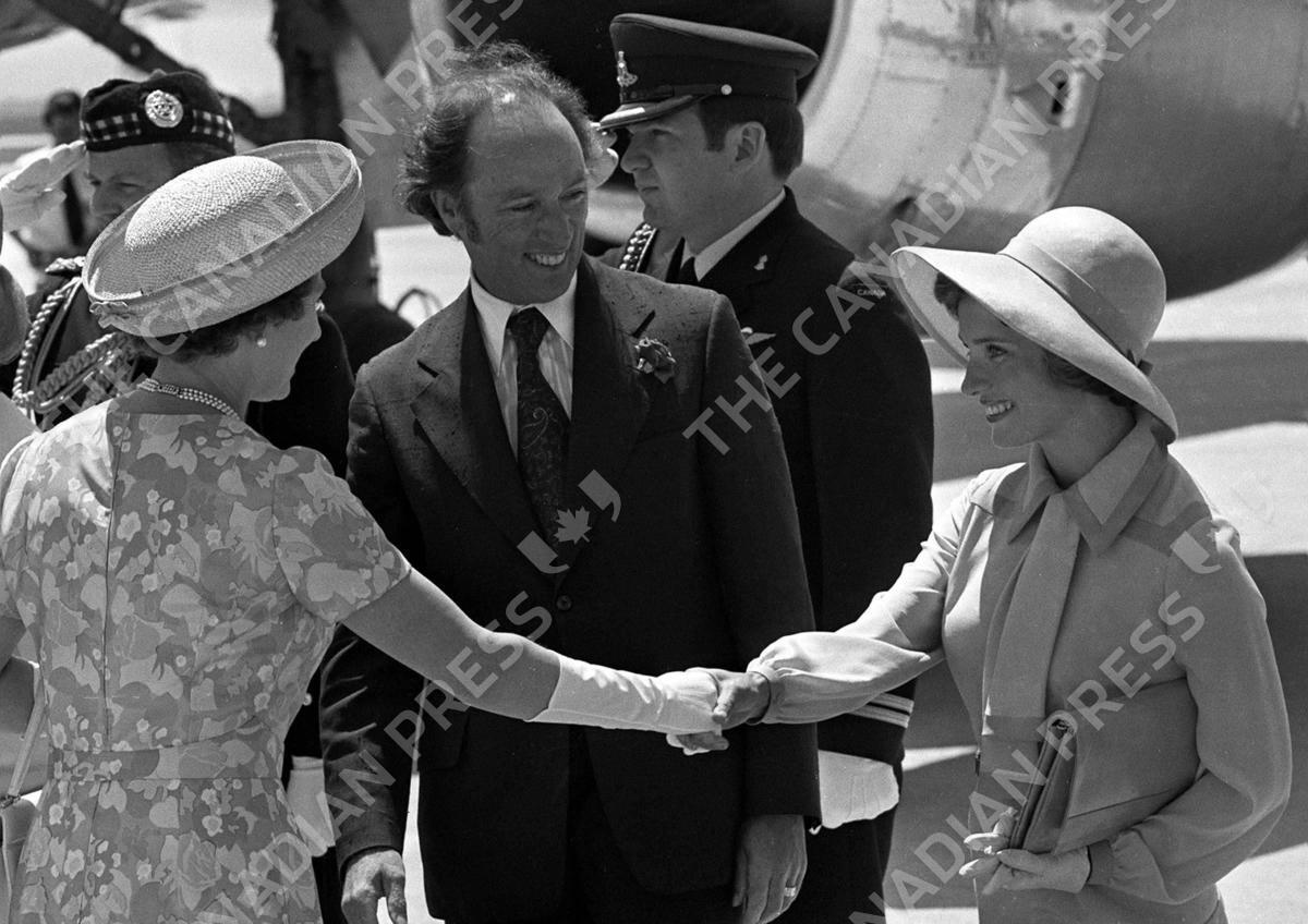 Prime Minister Trudeau and his wife, Margaret, welcome Queen Elizabeth II at Toronto International Airport, June 25, 1973. The Queen and Prince Philip began a 10-day tour of four provinces. (CP PHOTO)