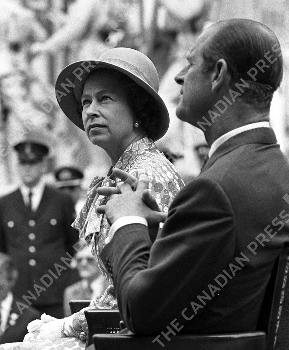 Queen Elizabeth II and Prince Philip listen to welcome speech by Premier Alex B. Campbell during the opening of Prince Edward Island's Centennial celebrations July 1, 1973. (CP PHOTO)