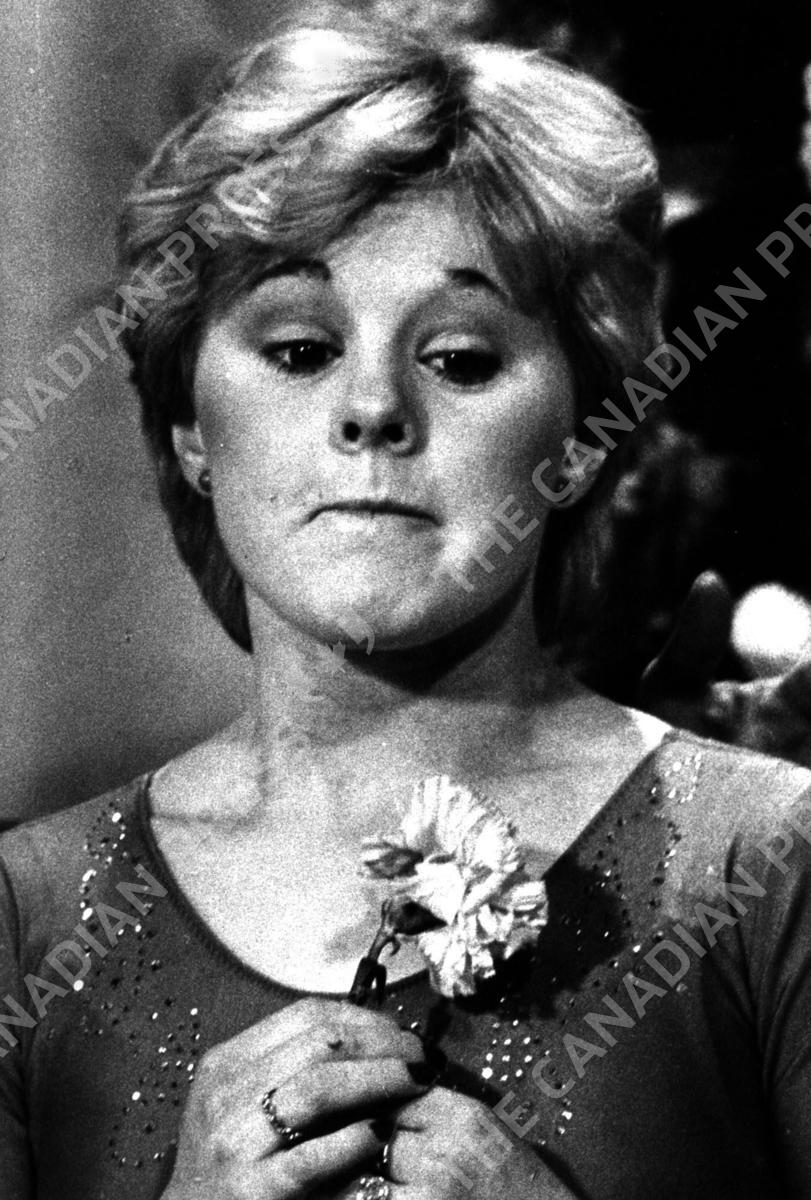 Elizabeth Manley waits for the judges to post her score following the senior women's short program in Brandon on January 29th, 1982. (CP PHOTO/Dave Buston)