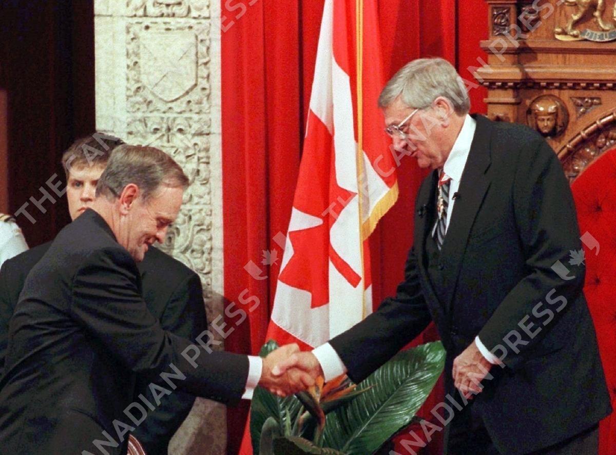 (OTT 104)OTTAWA, Sepot 23--Prime Minister Jean Chretien shakes Governor General Romeo LeBlanc's hand after the governments Throne Speech in Otttawa Tuesday.(CP PHOTO0 1997 (stf-Tom Hanson)th