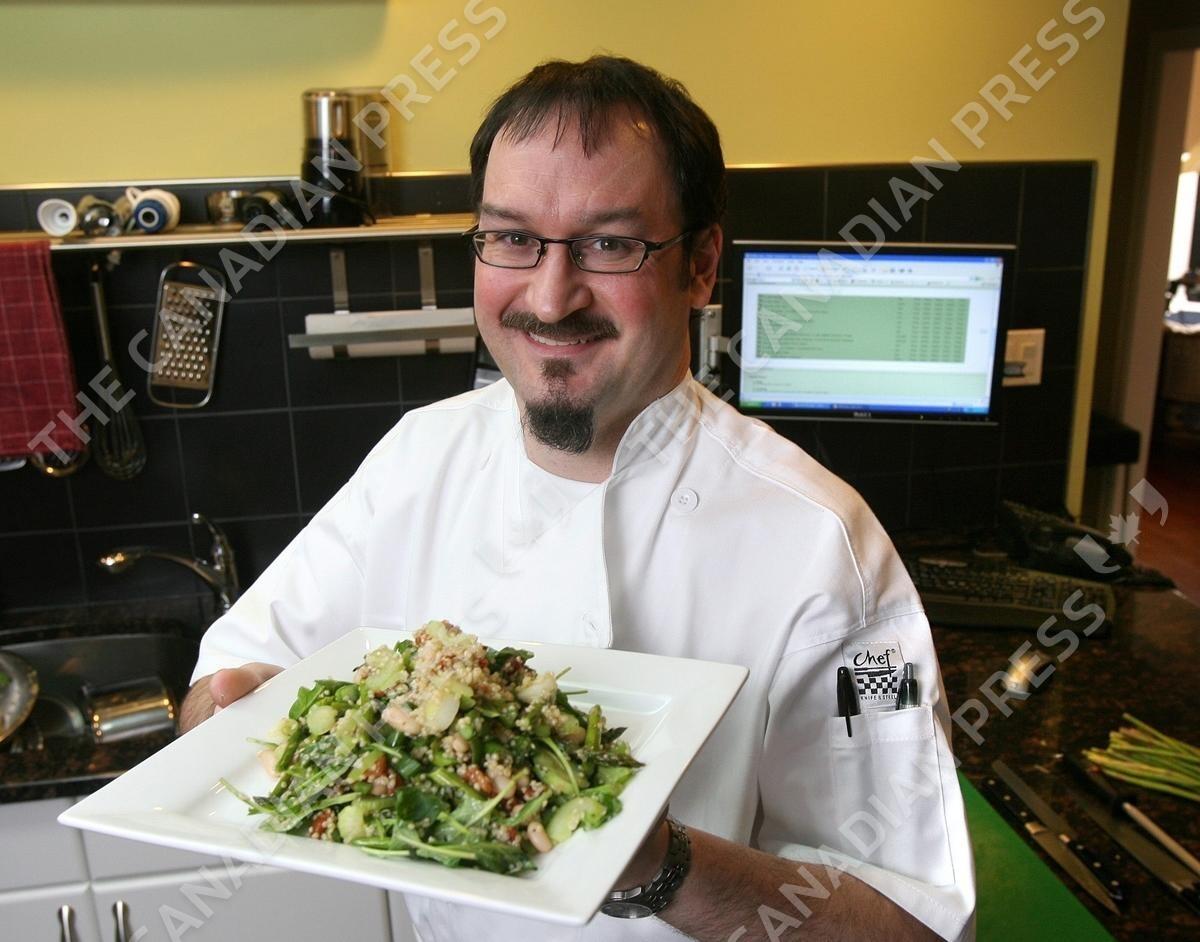 Chef Paul Routhier shows off his asparagus, white bean and quinoa salad Friday afternoon, Feb. 15, 2008 at his kitchen in Halifax. Ronthier is part of a new Internet recipe planning website called MealEasy. The new online subscription service allows users to select and plan meals according to particular lifestyle or health concerns, and then provides the user with the appropriate recipes, grocery lists and cooking directions. THE CANADIAN PRESS/Mike Dembeck