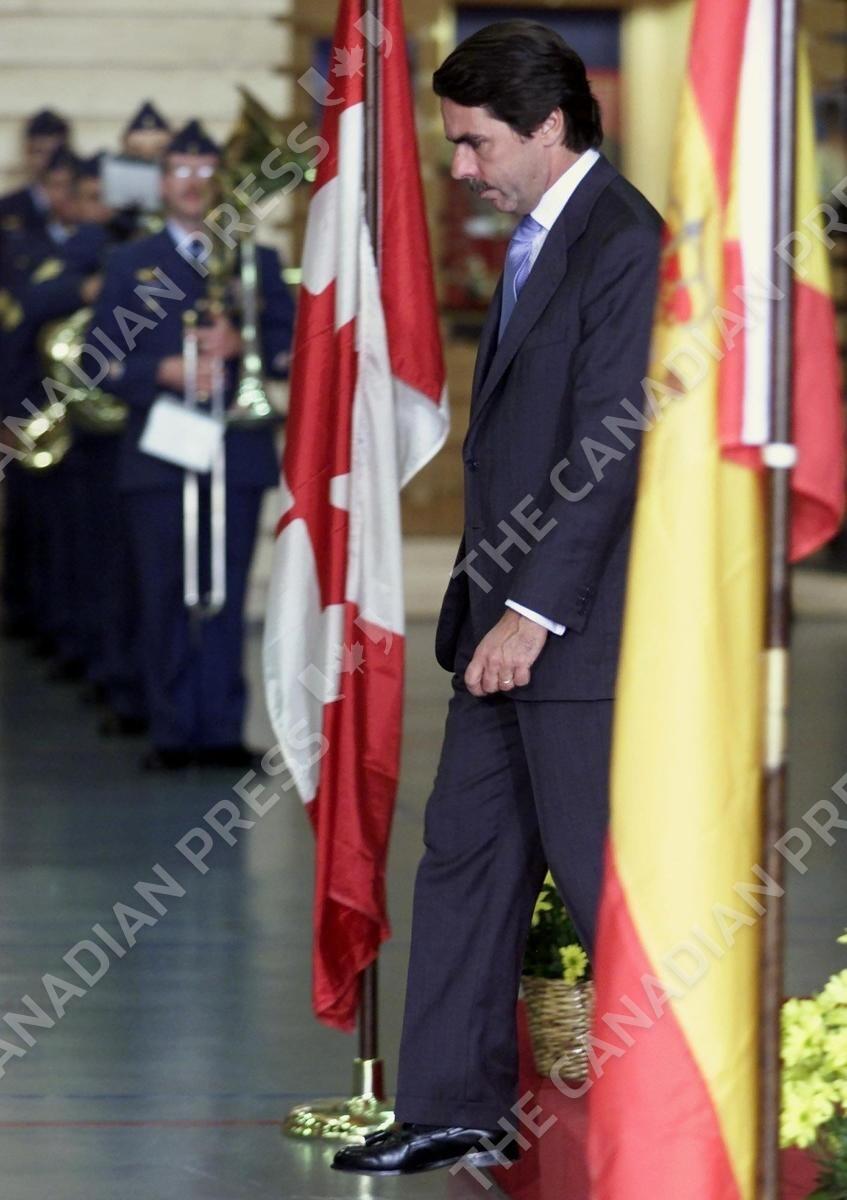 Spanish Prime Minister Jose Aznar walks between a Canadian and a Spanish flag during a welcoming ceremony following his arrival in Ottawa Tuesday May 29, 2001.(CP PHOTO/Tom Hanson)