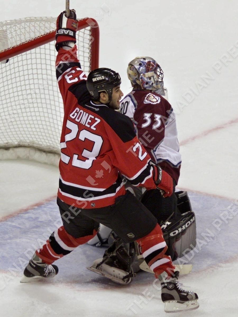 New Jersey Devils' Scott Gomez (left) celebrates teammate Turner Stevenson's goal as Clorado Avalanche goaltender Patrick Roy sits in the crease during first period game two Stanley Cup Finals action in Denver, Colo., Tuesday May 29, 2001. The Avalanche lead the best-of-seven series 1-0. (CP PHOTO/Kevin Frayer)