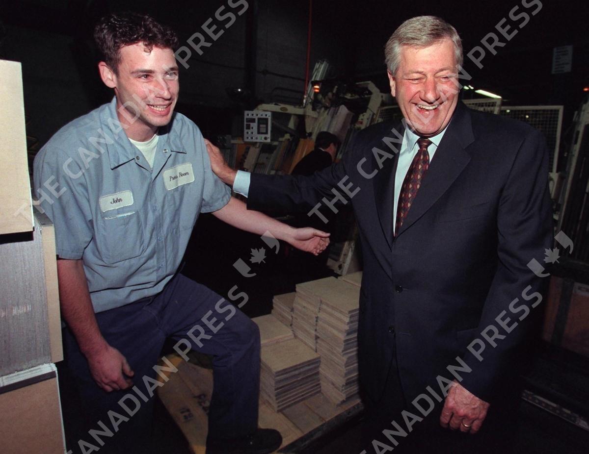 Ontario Premier Mike Harris (right) shares a laugh with an employee during a campaign stop at a Toronto area Quebecor printing plant Tuesday May.25, 1999. (CP PHOTO/Kevin Frayer)