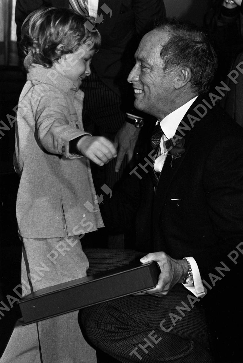Marko Miville, 6-years-old, reaches out to hug Prime Minister Pierre Trudeau after presenting him with a new constitution in Braille in Ottawa, Ont., April 17, 1982. (CP PHOTO/A. Glassburg)