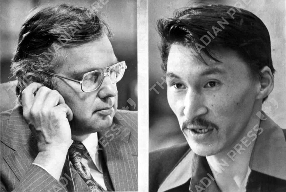 John Amagealik (right), director of land claims for the Inuit Tapirisat of Canada speaks to the Berger Commission in Ottawa on Thursday June 3, 1976, as Mr. Justice Thomas Berger listens to his brief. (CP PICTURE ARCHIVE/Fred Chartrand)