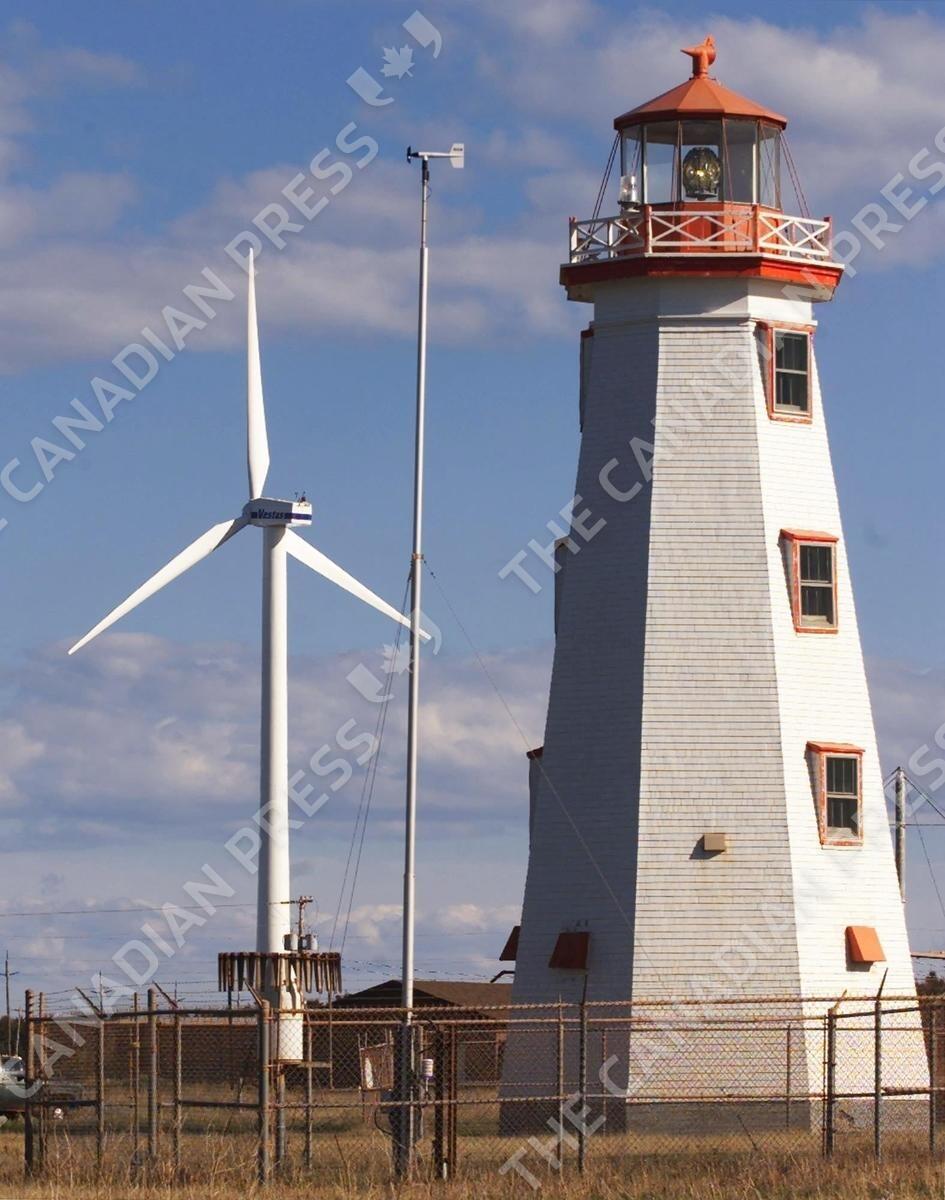 A massive turbine spins in the wind near the lighthouse in North Cape, Prince Edward Island on Monday, May 20, 2002. The site features eight state-of-the-art turbines and can supply two percent of the island's energy needs. Federal and provincial energy and environment ministers are meeting in Charlottetown, PEI, on Tuesday to discuss the Kyoto protocol. (CP PHOTO/Andrew Vaughan)
