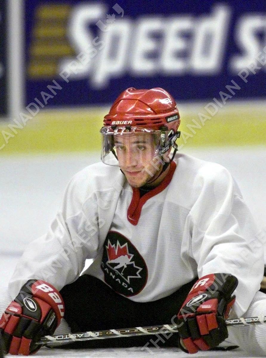 Team Canada forward Brandon Reid of Kirkland, Que. stretches at a team workout in Skelleftea, Sweden Thursday December 30, 1999. Canada plays the USA Friday in round-robin action at the tournament. (CP PHOTO/Kevin Frayer)