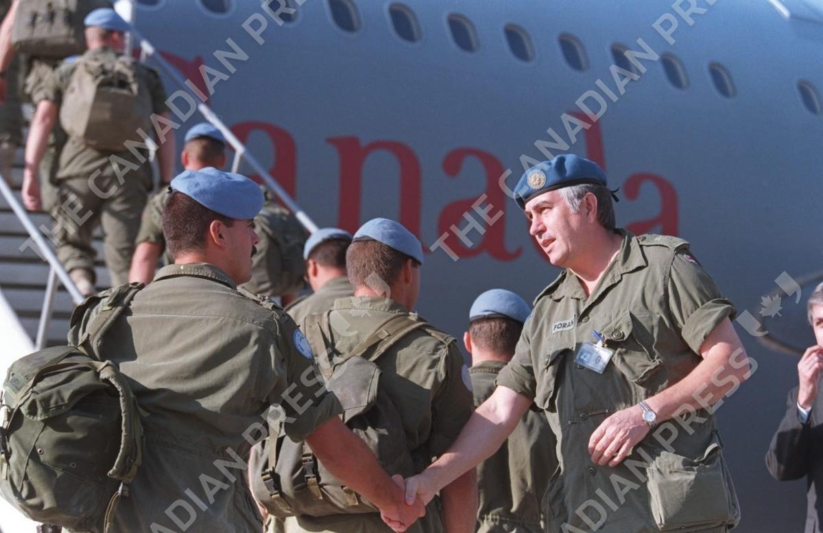 Canadian Brig. Gen. Alain Forand, Commander of UN forces in sector south Croatia, greets Canadian Peacekeepers from the Royal 22nd Regiment 2nd Battalion Wednesday, Sept. 6, 1995, as they board their plane for Quebec, Canada from Split Croatia. The first wave of approximately 760 Canadian peace keepers left for home ending their United Nations mandate in Croatia. (CP PHOTO/Tom Hanson)