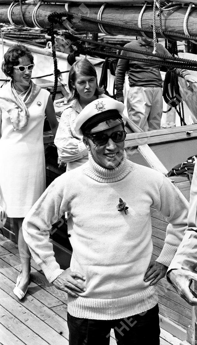 Prime Minister Pierre Trudeau stands on the deck of the Bluenose in Nova Scotia, Aug. 1972. (CP PHOTO/ Chuck Mitchell)