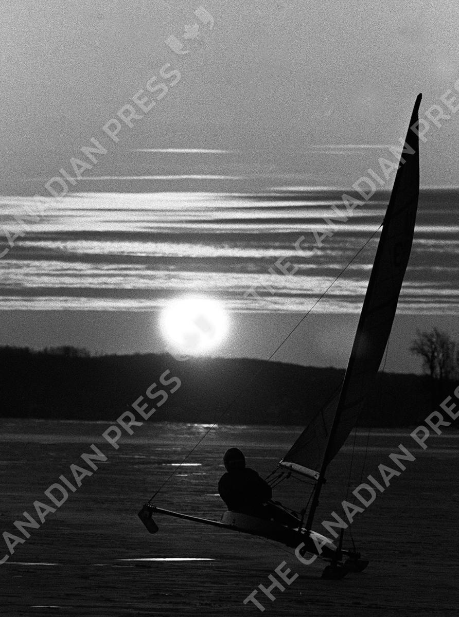 Mike Belcourt takes advantage of the last light of the day and a good wind to do a little ice sailing on Lake St. Louis, 20km west of Montreal. (CP PHOTO/Ron Poling)