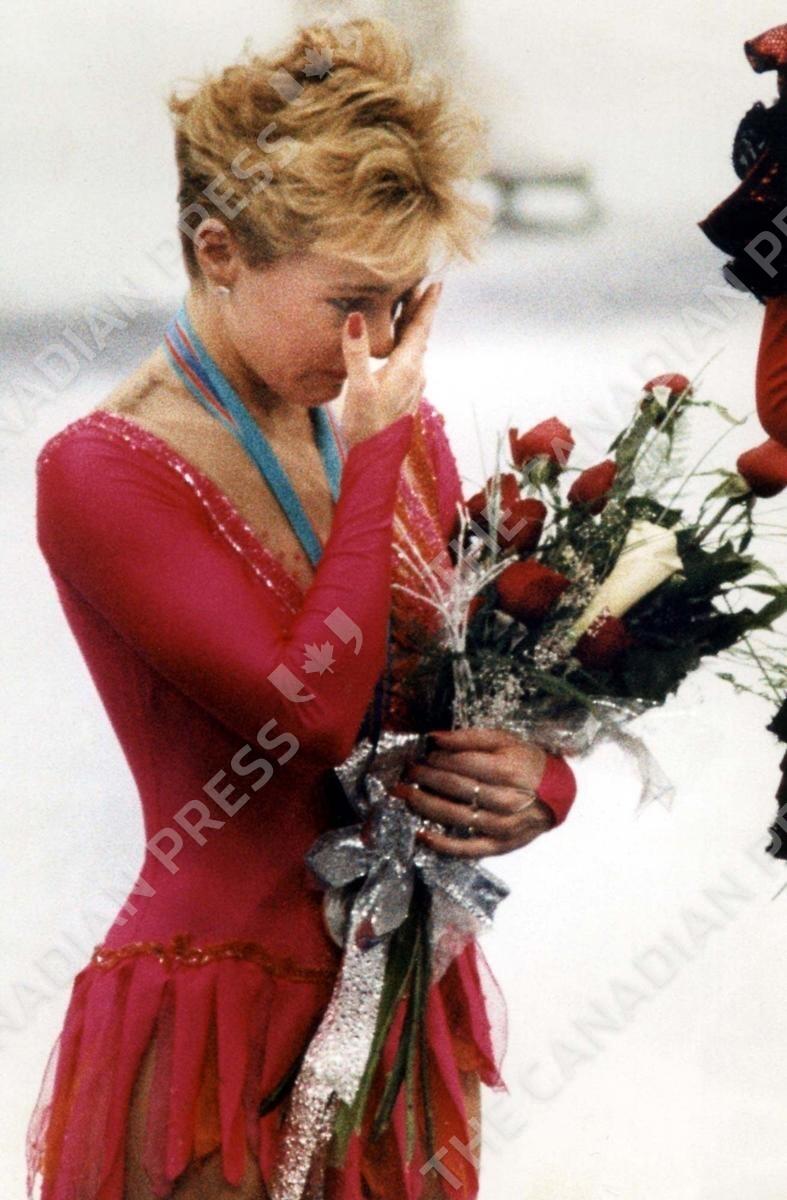 (CWG28) CALGARY, Feb.27--TEARS OF JOY--Ottawa's Elizabeth Manley wipes away the tears of joy after winning a silver medal in women's singles figure skating in Calgary Saturday at the XV Winter Olympics. (CP PHOTO) 1988 (Edmonton Journal-Chris Schwarz)