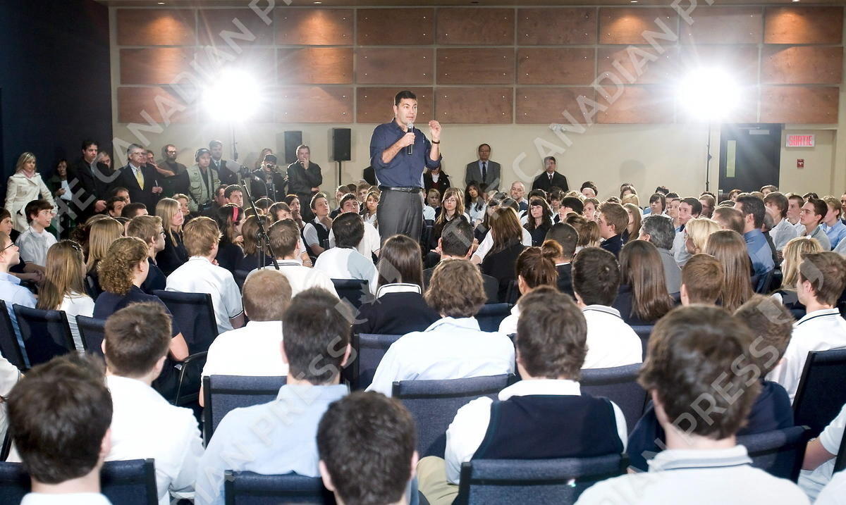 ADQ leader Mario Dumont gestures as he speaks to students at the Academie St-Louis high school in Quebec City, Wednesday November 12, 2008. The ADQ platform for the 2008 Quebec provincial election includes a major refit of the school system, including the abolishment of the school board. THE CANADIAN PRESS/Francis Vachon