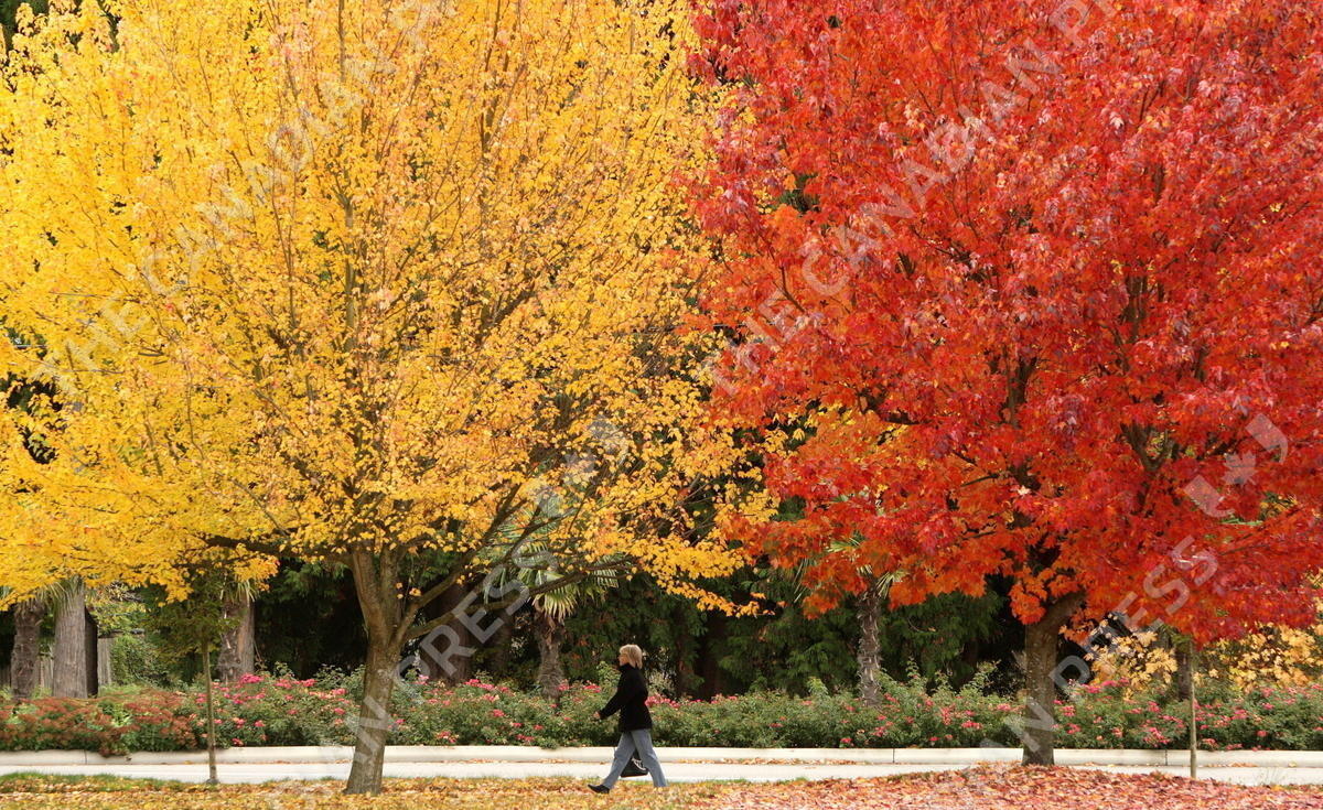 A pedestrian passes brightly coloured fall foliage in Delta, B.C., on Wednesday October 29, 2008. THE CANADIAN PRESS/Darryl Dyck