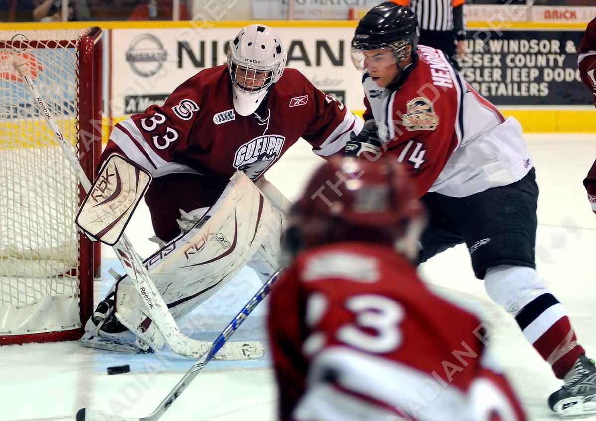 Guelph Storm's Thomas McCollum keeps a close eye as Windsor Spitfires' Adam Henrique moves in with the puck as Guelph's Tyler Melancon looks on during third period OHL hockey action in Windsor, Ontario on Thursday, October 23, 2008.