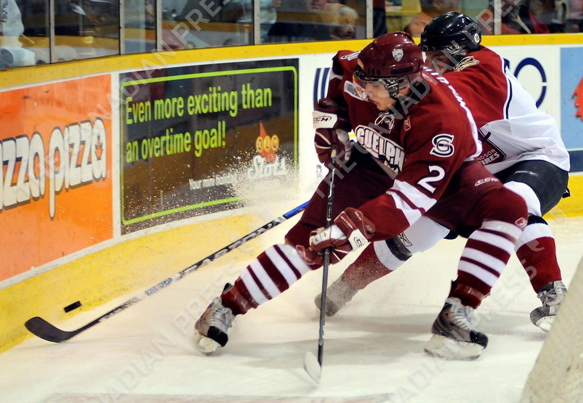 Windsor Spitfires' Taylor Hall reaches for the puck past Guelph Storm's Evgeny Molotliv, left, behind the Guelph net during first period OHL hockey action in Windsor, Ontario on Thursday, October 23, 2008.