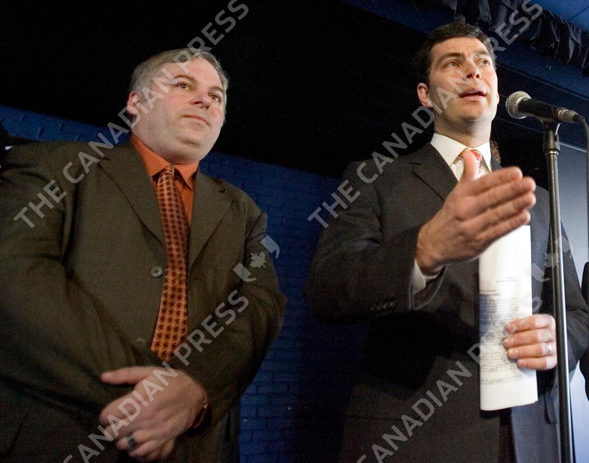 FILE--Action Democratique leader Mario Dumont, right, campaigns with Jean-Francois Plante at a youth drop-in centerl in St-Eustache, Que. Wednesday Feb. 28, 2007. Plante is resigning his candidacy after sparking a controversy when he made light of violence against women.(CP PHOTO/Ryan Remiorz)CANADA