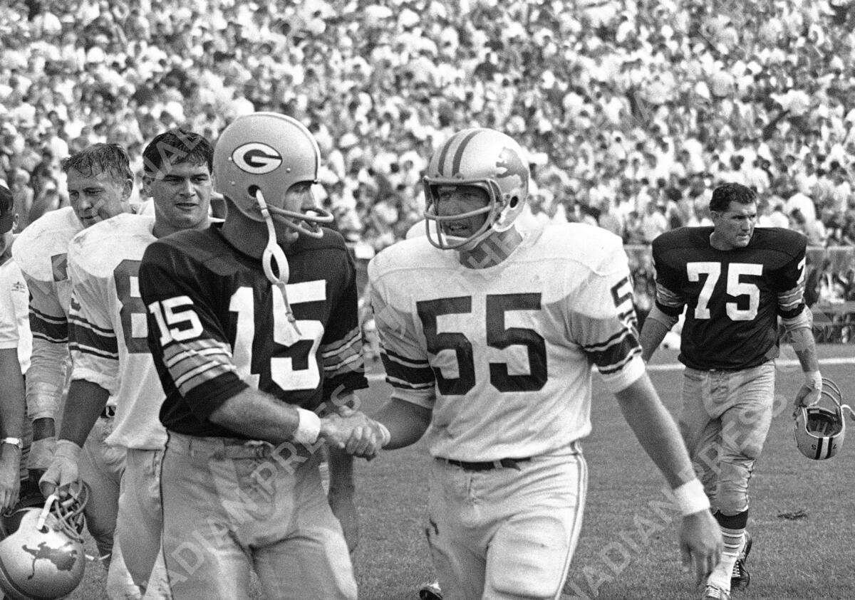 FILE - In this September 1967 file photo, Detroit Lions' Wayne Walker (55) shakes greets Green Bay Packers quarterback Bart Starr following an NFL football game in Green Bay, Wis. Walker, a Pro Bowl linebacker for the Lions and a broadcaster, has died. He was 80. The Lions say Walker died Friday, May 19, 2017. Walker said in 2015 he had Parkinson's disease. (AP Photo/File)