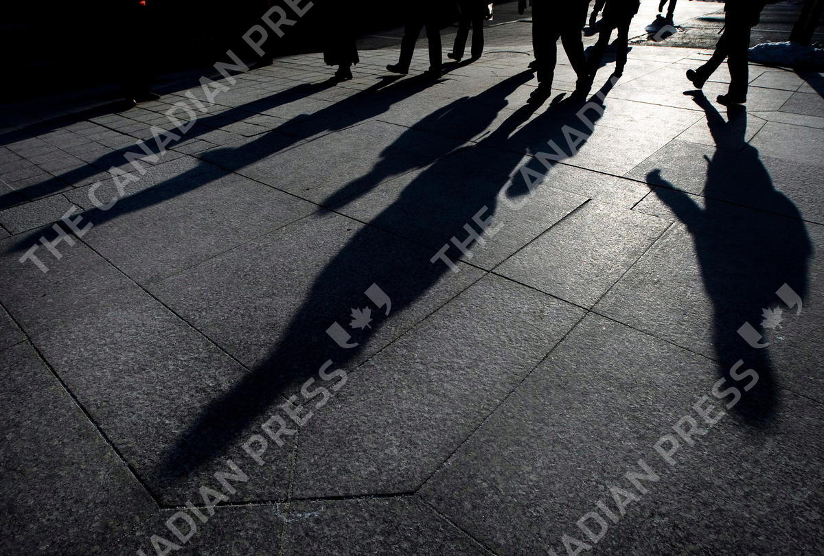 People cast their shadows on the sidewalks as they make their way home after work in downtown Toronto on Tuesday, Feb. 24, 2009. THE CANADIAN PRESS/Nathan Denette