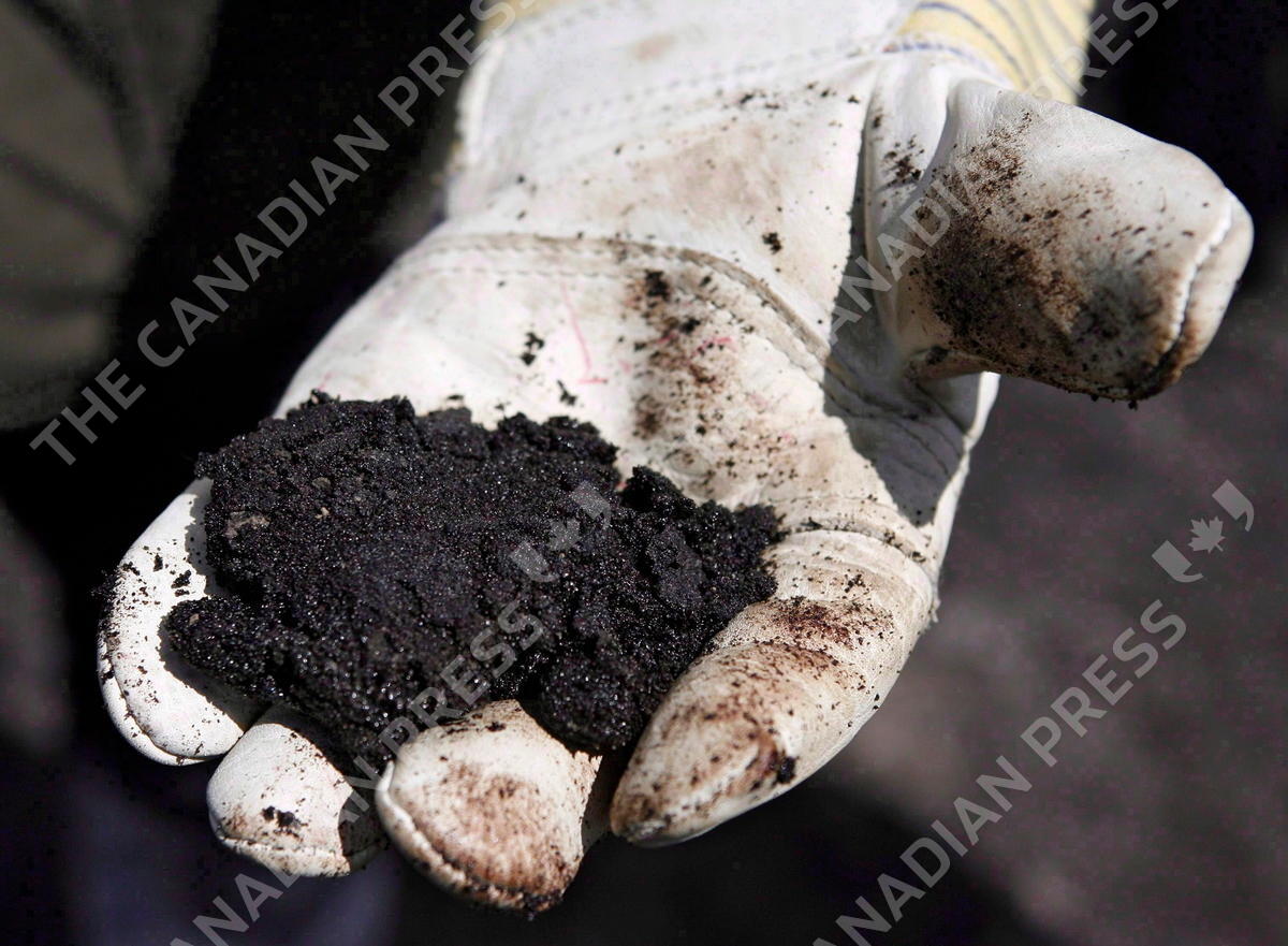 Ongoing pipeline project delays and growth in crude-by-rail capacity from Western Canada are leading some oilsands producers to consider spending billions of dollars to build diluent recovery units. An oil worker holds raw sand bitumen near Fort McMurray, Alta., on July 9, 2008. THE CANADIAN PRESS/Jeff McIntosh