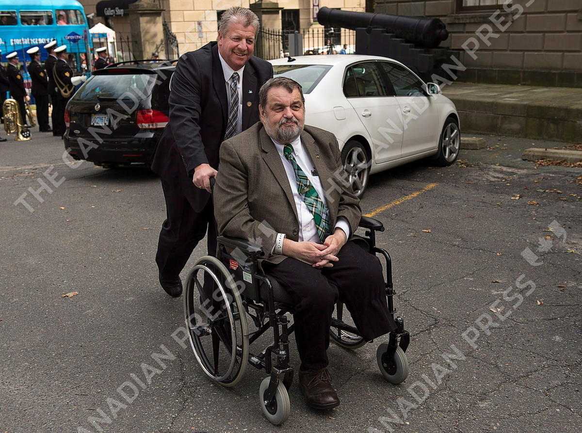 Conservative MLA Alfie MacLeod is wheeled by fellow Conservative MLA Eddie Orrell as they arrive for the throne speech at the Nova Scotia legislature in Halifax on Thursday, September 25, 2014. A trio of Nova Scotia Progressive Conservatives who faced criticism for continuing to draw a provincial salary as members of the legislature after winning federal nominations are stepping down at the end of this month. THE CANADIAN PRESS/Andrew Vaughan