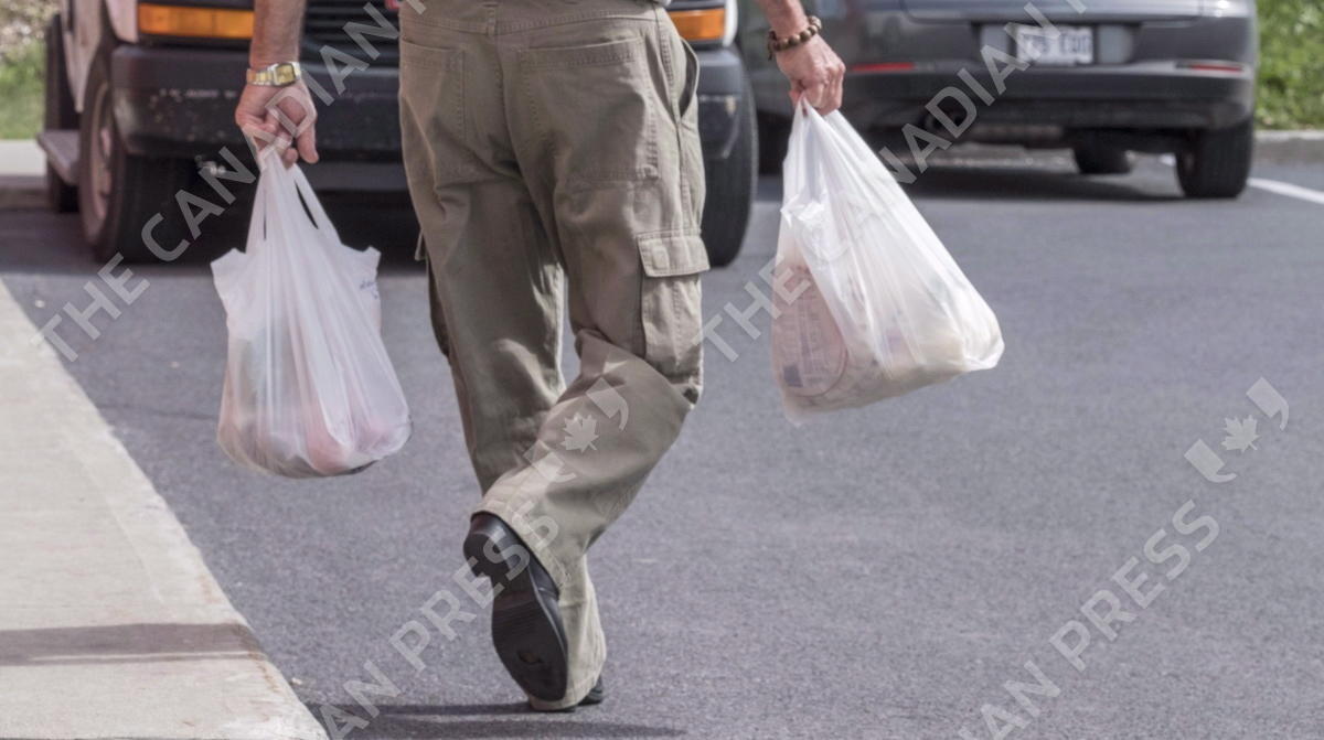 A shopper leaves a grocery store carrying his groceries in plastic bags in Brossard, Que on August 30, 2016. Shoppers at Sobeys Inc. grocery stores will soon need to bring their own totes to pack their purchases or lug them home in paper bags as the chain moves to phase out plastic bags by February 2020. THE CANADIAN PRESS/Paul Chiasson