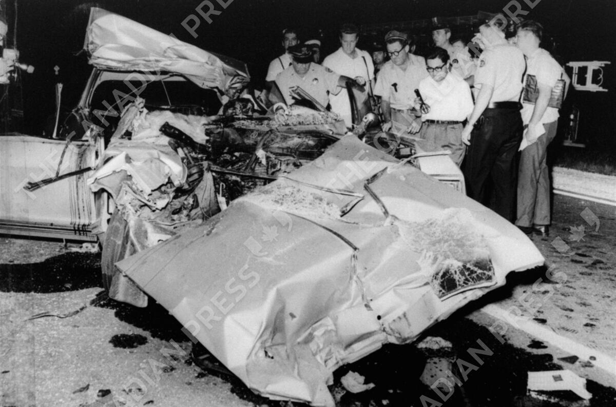 FILE - This June 29, 1967, file photo shows the mangled car that actress Jayne Mansfield died in after colliding with a truck, on Route 90 outside of New Orleans. Fifty years after Mansfield car slammed underneath a tractor-trailer, auto safety advocates say hundreds of similar deaths annually could be prevented by guard rails mounted beneath trucks. New York Sen. Charles Schumer has called on federal regulators to require truck underride guards after two cars skidded under a jackknifed milk tanker in northern New York earlier this month. (AP Photo/File)
