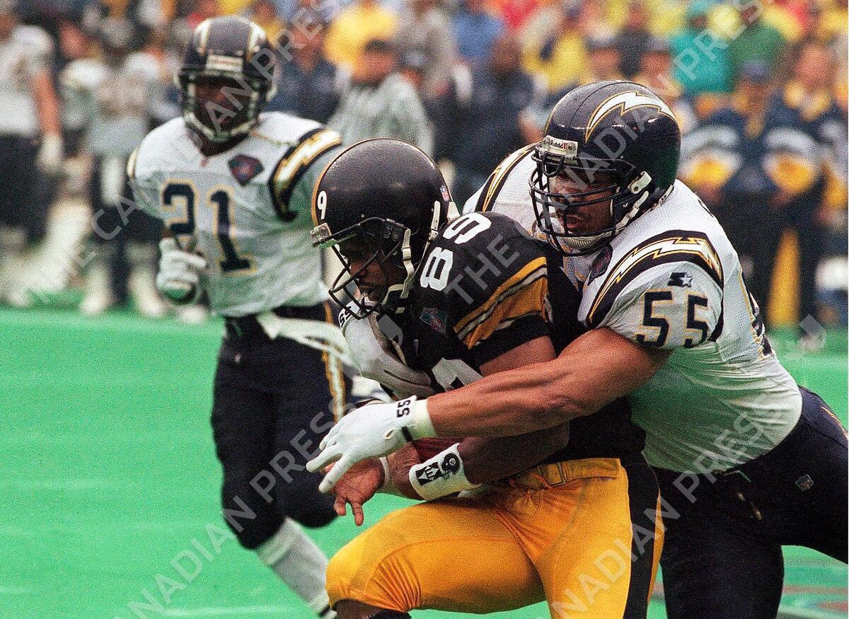FILE - In this Jan. 15, 1995, file photo, San Diego Chargers' Junior Seau, right, tackles Pittsburgh Steelers Ernie Mills during the first quarter of the AFC Championship NFL football game in Pittsburgh. Senior U.S. District Judge Anita Brody in Philadelphia, announced Thursday, Aug. 29, 2013, that the NFL and more than 4,500 former players want to settle concussion-related lawsuits for $765 million. The plaintiffs include at least 10 members of the Pro Football Hall of Fame, along with and the family of Seau, who committed suicide last year. The global settlement would fund medical exams, concussion-related compensation and medical research. (AP Photo/Keith Srakocic, File)