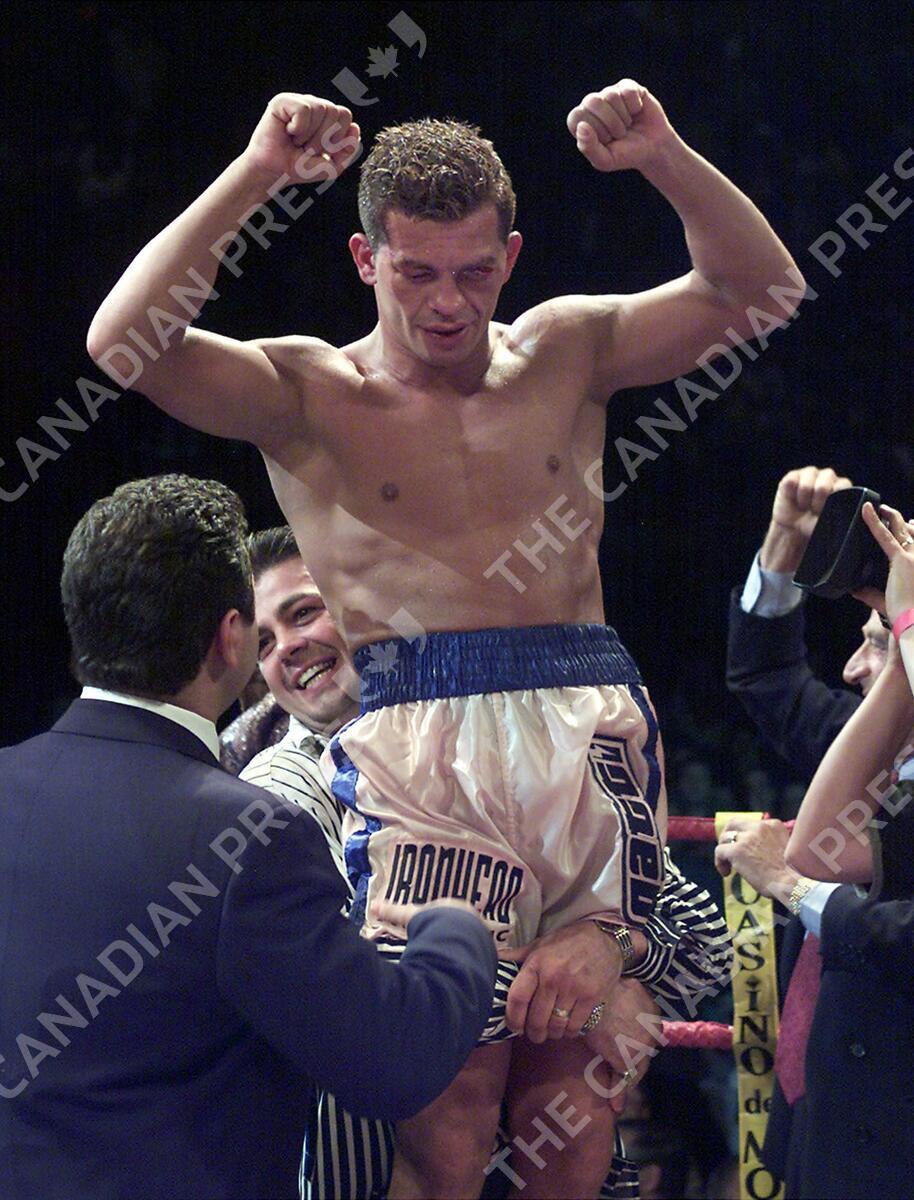 Arturo Gatti of Jersey City, New Jersey celebrates his unanimous decision victory over Joe Hutchison of Indianapolis, Indiana in welterweight division boxing Friday, Sept. 8, 2000 in Montreal. (CP PHOTO/Paul Chiasson)