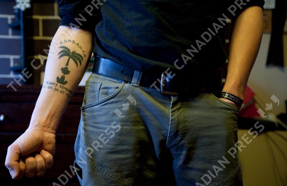 Sgt. Jimmy Collins is seen showing his tattoo from his Kamloops, B.C. home Dec 20, 2010. The tattoo bears the initials of Pte. Garrett Chidley, Sgt. George Miok, Cpl. Zachery McCormack, Sgt. Kirk Taylor and journalist Michelle Lang who were all killed by a roadside bomb in Afghanistan Dec 30, 2009. THE CANADIAN PRESS/Jonathan Hayward