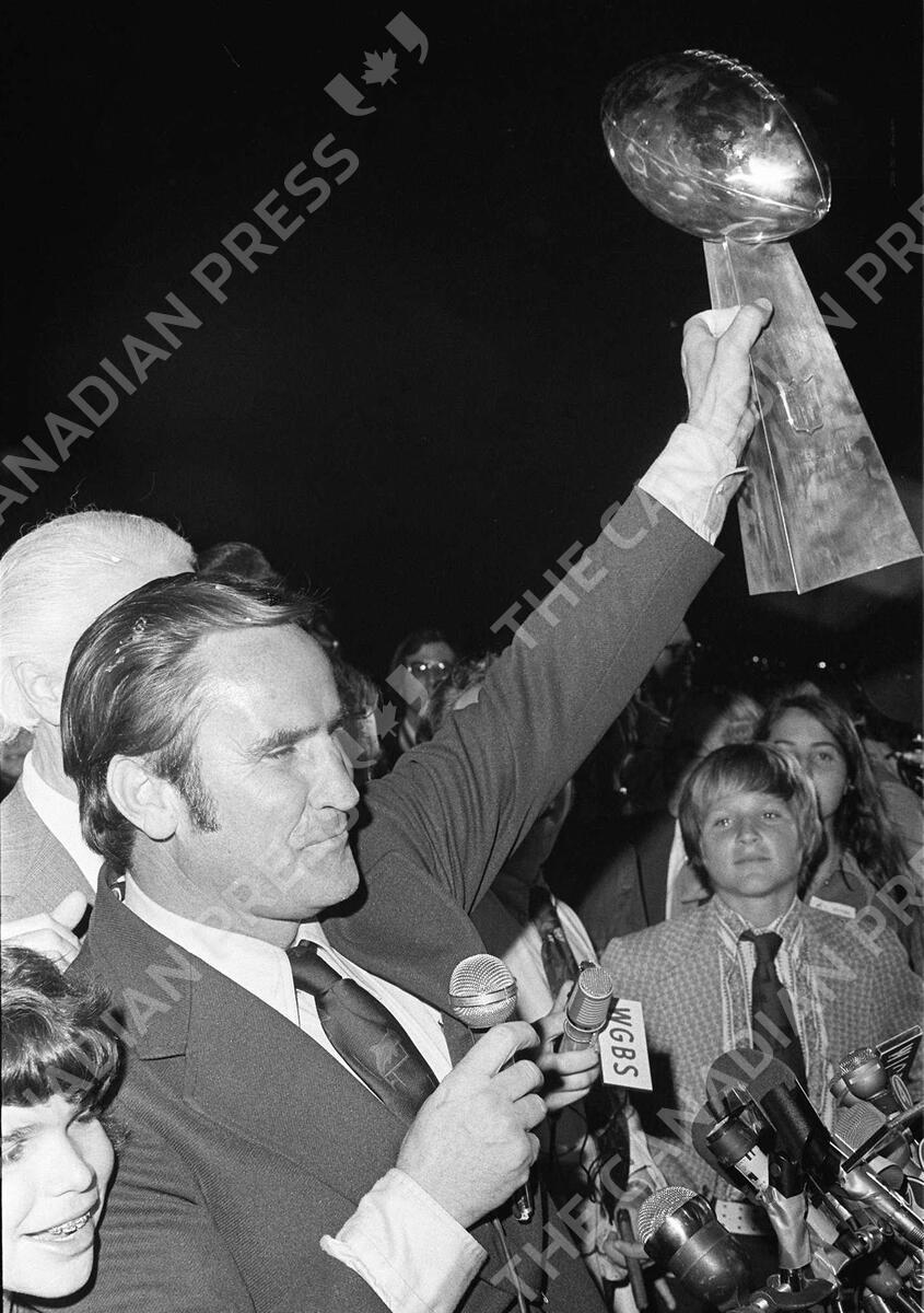 ** FILE ** Miami Dolphins coach Don Shula waves the Super Bowl trophy for fans Jan. 15, 1973, in Miami as the team arrived after winning the Super Bowl. Shula was an NFL coach for 33 years and won a record 347 games. That includes 17 victories in 1972, when Shula's Miami Dolphins achieved the league's lone perfect season. Shula's son David looks on at right. (AP Photo/file)