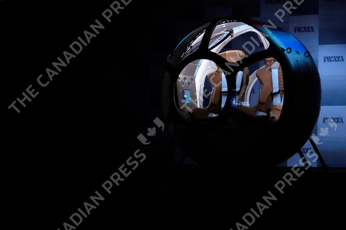 A two-seater cabin that a startup company says is capable of rising to an altitude of 15 miles, which is roughly the middle of the stratosphere, is displayed during a news conference in Tokyo, Tuesday, Feb. 21, 2023. The Japanese startup company announced plans Tuesday to launch a commercial space viewing balloon flight that it hopes will bring down to earth an otherwise astronomically expensive experience. (AP Photo/Eugene Hoshiko)