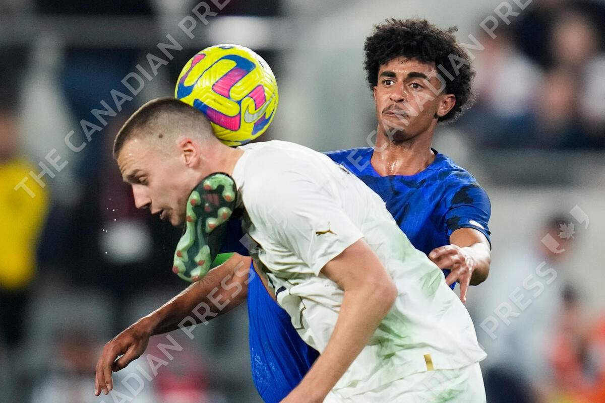 United States defender Jalen Neal, right, kicks Serbia forward Nikola Stulic in the neck as the ball lands on his head during the second half of an international friendly soccer match in Los Angeles, Wednesday, Jan. 25, 2023. (AP Photo/Ashley Landis)