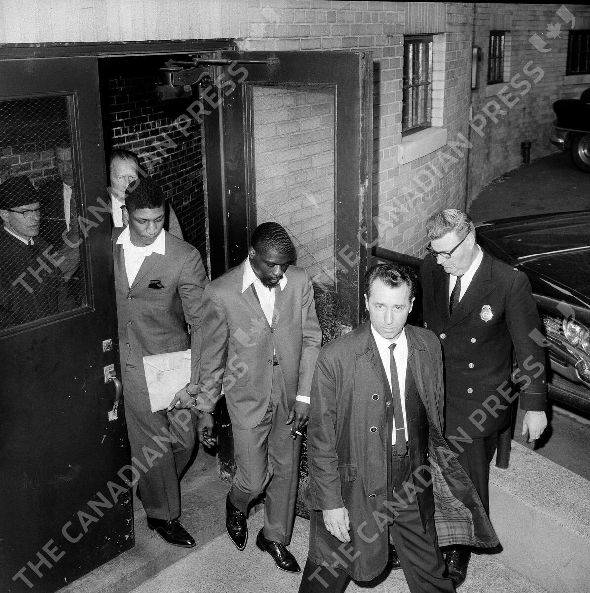 Co-defendants John Artis and Rubin "Hurricane" Carter, bearded man on right, leaving Pasaic County Courthouse Annex in Paterson, N.J., May 25, 1967, after they were found guilty of first degree murder in connection with slaying on June 17 of last year. They were on trial for first degree murder in connection with the slaying of James Oliver of Paterson, Fred Nauyoks, of Cedar Grove, N.J., and Hazel Tanis, of Hawthorne, N.J.. Carter was a one-time challenger for the middleweight boxing title. (AP Photo)