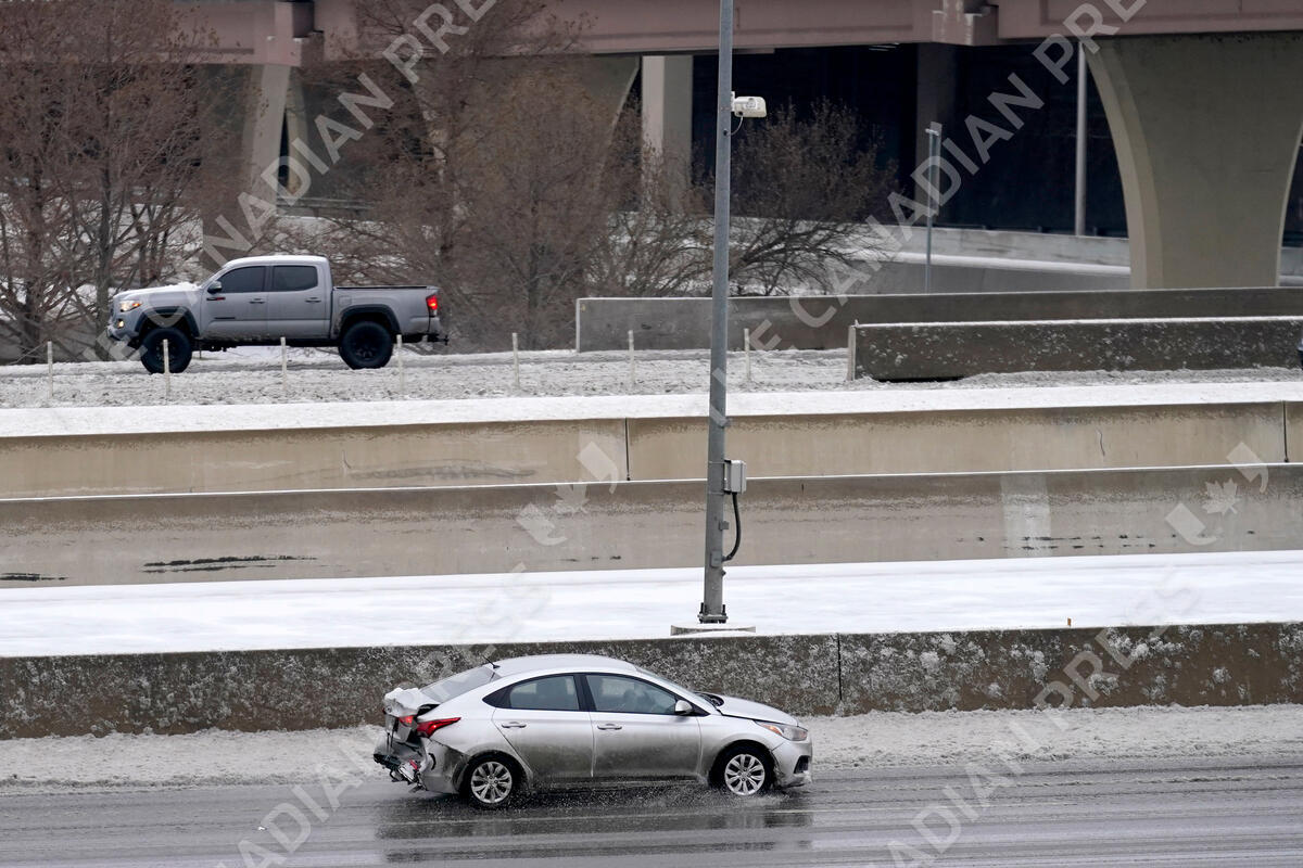 Drivers slowly navigate through icy road conditions on LBJ 635 Freeway, Tuesday, Jan. 31, 2023, in Dallas. (AP Photo/Tony Gutierrez)