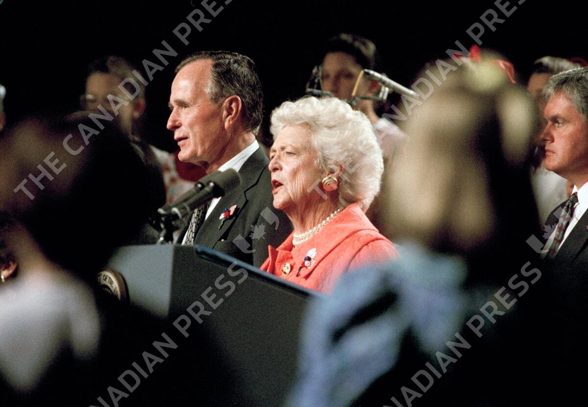 FILE - In this Aug. 20, 1992 file photo, President George H.W. Bush and first lady Barbara Bush join in song during an ecumenical prayer breakfast in Houston, before Bush delivered a speech as he accepted the nomination of the Republican Party to serve a second term. President Barack Obama's "we can't wait" refrain is all about projecting a sense of urgency and bold action heading into his fourth year in office. It turns out recent presidents haven't had much luck with that. The fourth year is often a disappointment, particularly when a president facing re-election is trying coax action out of a Congress in the hands of the other party. The heady optimism of earlier years gets bogged down in partisan bickering, and big initiatives give way to less ambitious steps. (AP Photo/James Finley, File)