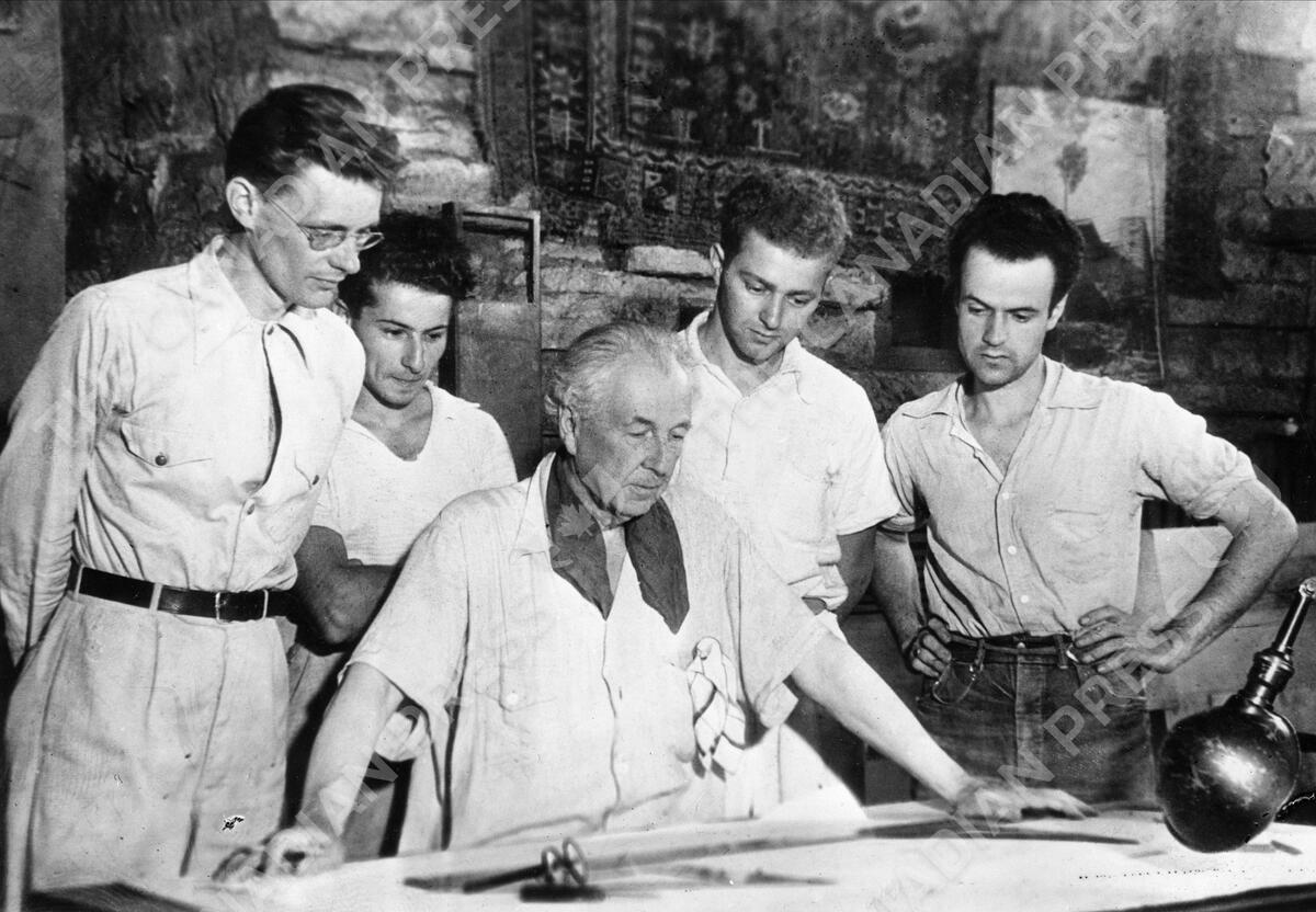 **ADDS ID'S OF APPRENTICES** FILE - In an Aug. 17, 1938 file photo, architect Frank Lloyd Wright, center, is surrounded by four apprentices who work and study under his direction at Taliesin, his estate at Spring Green, Wis. The apprentices are, from the left; Eugene Masselink, Bernard Dombar, Edgar Tafel and Jack Howe. Tafel died Jan. 18, 2011 at his Manhattan home. He was the last surviving member of the original Taliesin fellows, a community of young apprentice architects established in 1932 at Wright's home and school in Spring Green, Wis., said Robert Silman, a longtime friend and New York structural engineer. He was 98. (AP Photo, File)
