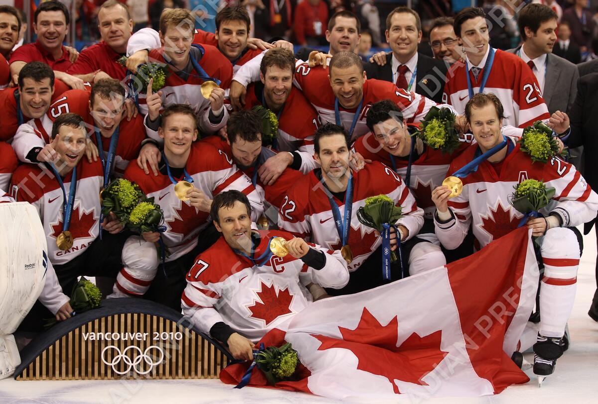 Members of team Canada celebrate after winning the gold medal game against the USA in the men's ice hockey gold medal final at the 2010 Winter Olympic Games in Vancouver, Sunday, Feb. 28, 2010. THE CANADIAN PRESS/Jonathan Hayward