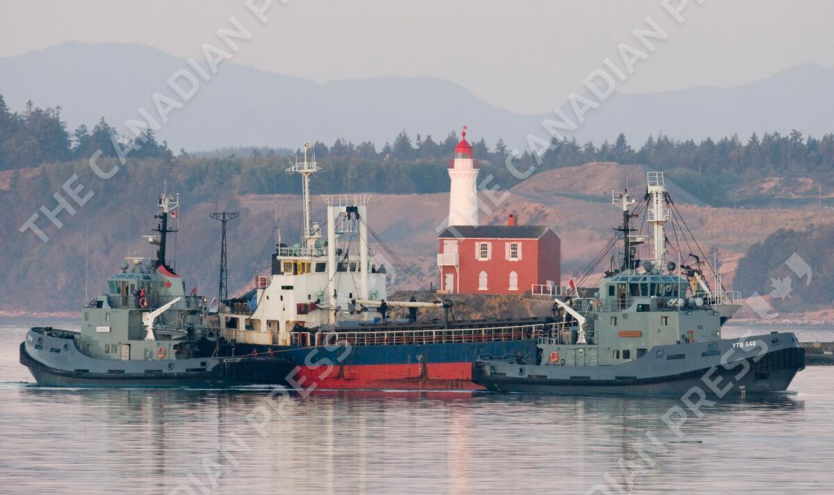 The MV Sun Sea is escorted past Fisgard Lighthouse and into CFB Esquimalt in Colwood, B.C.,Friday, Aug. 13, 2010. The suspect Tamil migrant boat is believed to be holding as many as 500 refugees with unknown numbers of women and children. THE CANADIAN PRESS/Jonathan Hayward
