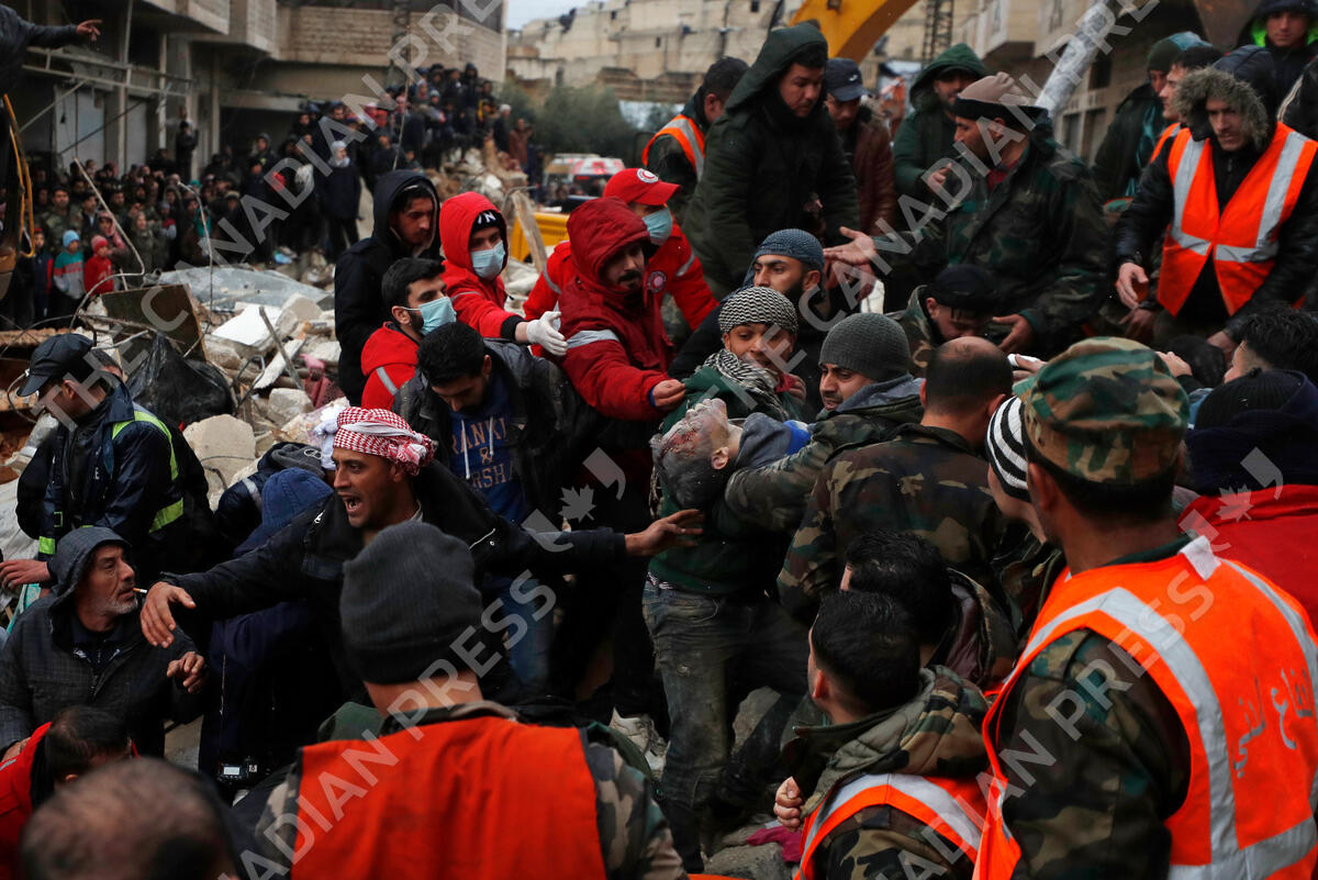 Civil defense workers and security forces carry an earthquake victim as they search through the wreckage of collapsed buildings in Hama, Syria, Monday, Feb. 6, 2023. A powerful earthquake has caused significant damage in southeast Turkey and Syria and many casualties are feared. Damage was reported across several Turkish provinces, and rescue teams were being sent from around the country. (AP Photo/Omar Sanadiki)