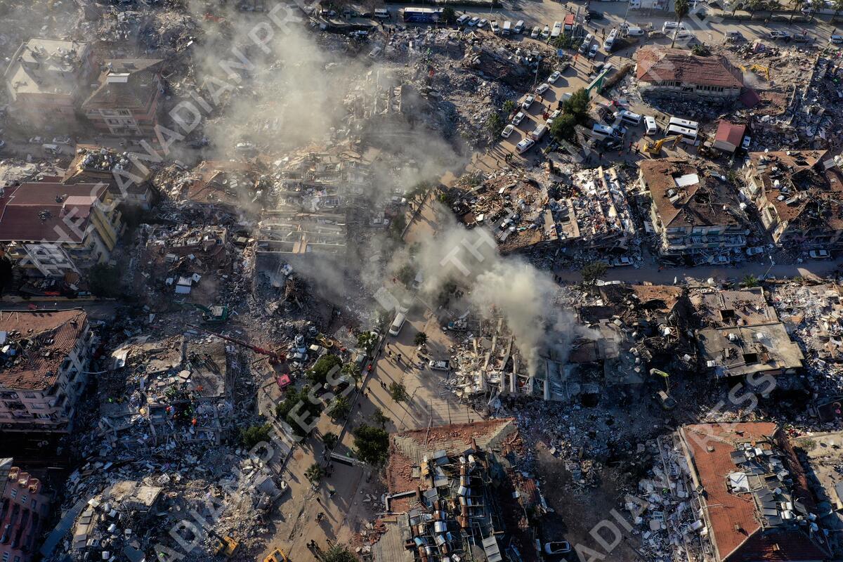 In this drone photo, destroyed buildings are seen from above in Antakya, southeastern Turkey, Thursday, Feb. 9, 2023. Thousands who lost their homes in a catastrophic earthquake huddled around campfires and clamored for food and water in the bitter cold, three days after the temblor and series of aftershocks hit Turkey and Syria. (AP Photo/Hussein Malla)