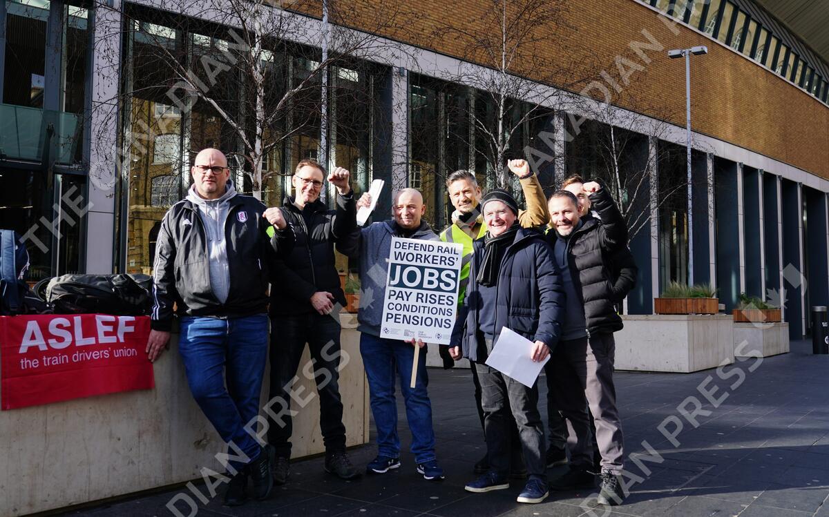 Aslef train workers on the picket line at London Bridge station in London. Train driver members of Aslef and the Rail, Maritime and Transport union (RMT) are taking to picket lines again in a long-running dispute over pay, jobs and conditions. Picture date: Friday February 3, 2023.