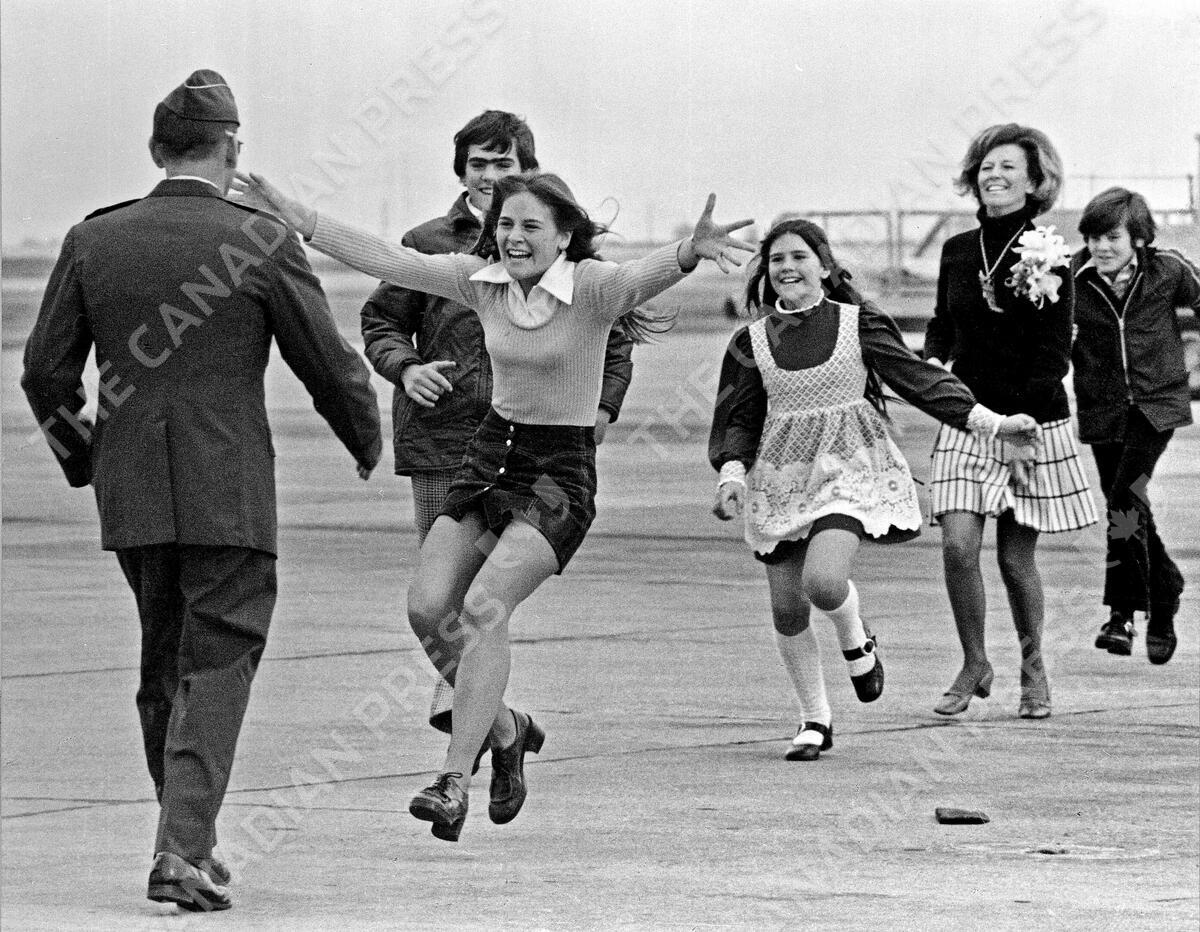 FILE - This March 17, 1973 file photo shows released prisoner of war Lt. Col. Robert L. Stirm being greeted by his family at Travis Air Force Base in Fairfield, Calif., as he returns home from the Vietnam War. In the lead is Stirm's daughter Lori, 15; followed by son Robert, 14; daughter Cynthia, 11; wife Loretta and son Roger, 12. On Thursday, May 24, 2013, some 200 former POWs, almost all of them former pilots, will reunite for a three-day celebration at the Richard Nixon Presidential Library & Museum in Yorba LInda, Calif., that coincides with the 40th anniversary of a star-studded White House dinner hosted by President Nixon to honor their sacrifice. At the time, Nixon was embroiled in Watergate, but the former prisoners, now in their 60s and 70s, credit him with their freedom and have no qualms about expressing their loyalty for the 37th president. This photo won the Pulitzer Prize for News Photography in 1973. (AP Photo/Sal Veder, File)