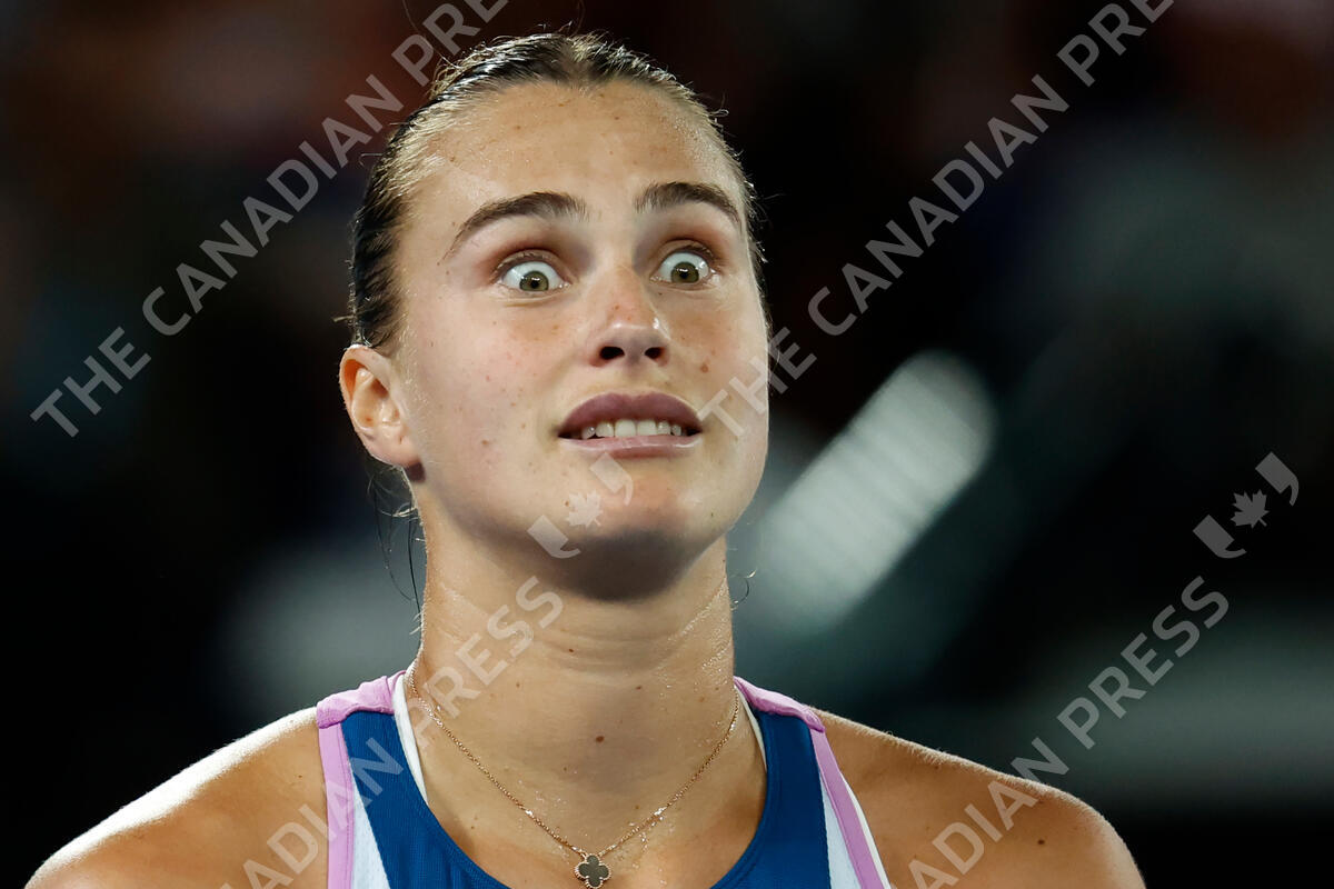 Aryna Sabalenka of Belarus reacts after losing the first game of the third set to Elena Rybakina of Kazakhstan in the women's singles final during the women's singles final at the Australian Open tennis championship in Melbourne, Australia, Saturday, Jan. 28, 2023. (AP Photo/Asanka Brendon Ratnayake)